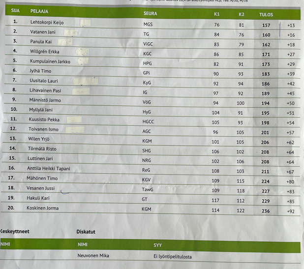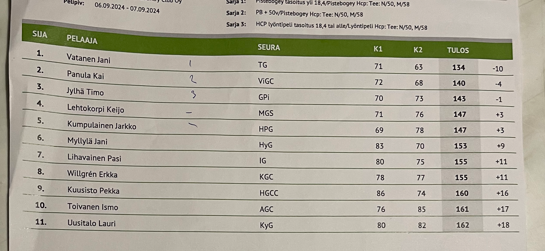 HCP SARJAN  vei Vatanen nimiinsä hieno toisen päivän ansiosta -9 alle tasoituksen kokonaistuloksen ollen -10 alle toinen Panula Kai -4 ja kolmas Jylhä Timo -1 Timolle myös suur kiitos osallistumisesta palkintopöydän luomisessa.